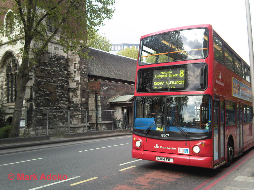 To the left of the bus is Bow Church (not the one famous for its bells, as I erroneously stated earlier; that is St. Mary-le-Bow, off Cheapside – also served by the 8, coincidentally). The church in Bow is located between the two directions of the road, and a better view of the building, from the other carriageway, is provided in the second shot as sister vehicle 18207 (LX04 FWT) approaches its final stop on 15 May 2010. The blinds do not appear to fit the blind box very well.