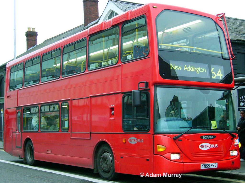 These days the 64 runs from Metrobus's new garage in Beddington Farm, which still has many Omnidekkas for other routes, which still appear on the 64 from time to time. I have therefore added this photo (taken during the previous contract) of Metrobus 905 (YN55 PZG) – actually an Orpington machine for the 161, photographed in May 2006, before the Beddington garage opened. Of the original '64 batch' (451-468) a few have left the fleet, but most have gone back to Orpington garage to replace others to provincial work at Crawley garage, replacing Olympians.
