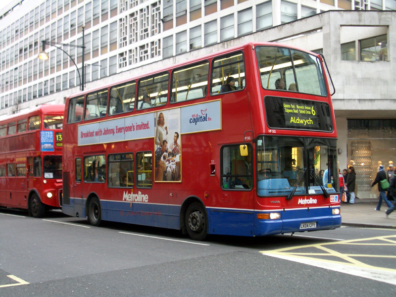 As noted above the 6 recently lost crew-operated Routemaster buses in favour of modern low-floor driver only vehicles. These are short wheelbase Volvo B7TLs, and VP512 (LK04 CPY) is seen passing BHS in Oxford Street, approaching Oxford Circus, on Friday 18 February 2005. Note the gold trim outlining the advert panel - this denotes a premium advertising space, and should be used on routes in central London. The picture is already out of date as RMs in Oxford Street are a thing of the past!