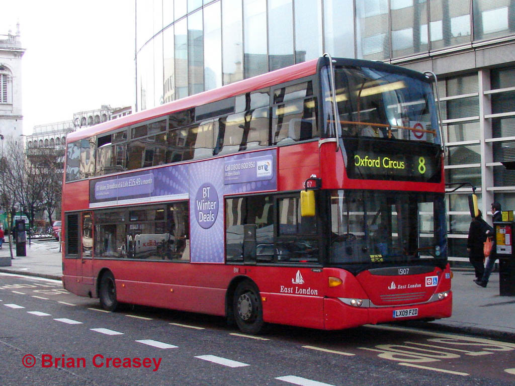 Bow garage has an allocation of Scania OmniCity double deckers for route 205, this being the new standard double deck type thus far since East London was sold to Macquarie. These sometimes stray onto the 8, as exemplified by 15107 (LX09 FZD) seen at Holborn Circus heading into town on Friday 5 February 2010.