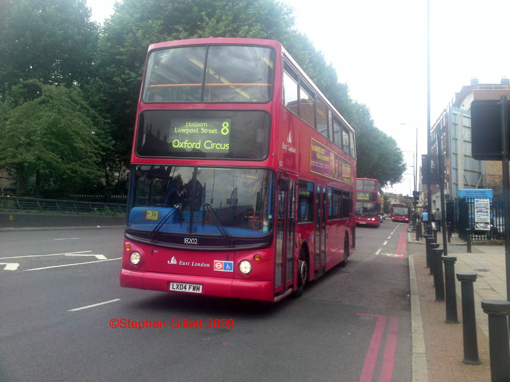 These days the route is run by standard Stagecoach issue Tridents, though they have all been repainted into allover red East London livery since Stagecoach sold the company. The first view shows 18202 (LX04 FWM) just setting off from its home garage on 1 August 2009 and (as seems to have been quite a common theme on here lately!) actually heading directly away from its destination. Having already turn left from Fairfield Road the bus will turn left again onto East Cross Route and left a third time onto Tredegar Road, before picking up the traditional route from Old Ford.