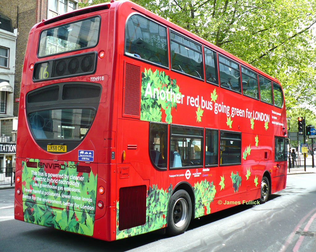 Cricklewood garage also received the first of the hybrid versions of the Enviro400 for Metroline, which were prainted in a special "green leaves" livery for hybrids when they were special, unlike the plain red of TEH1227 above. TEH918 (LK58 CPU) rounds Marble Arch on 8 August 2010, on its way back to its home garage, Cricklewood, where the 16 route now, once again, finishes.