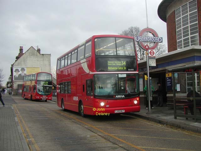 The 34 has “always” gone past Arnos Grove station, and brand new DLA 353 (LJ03 MLF) of Arriva London is seen at this location on a gloomy spring day. Heavy school loadings had meant a number of double deck journeys had to be run at school start and finish times alongside the main Dart allocation, so in the latest re-tendering exercise it was decided to put in a full double deck allocation instead, as well as a slight increase in frequency.