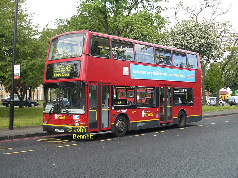 In their place on the 45 are Plaxton bodied B7TLs, much the most common combination at London Central/General. Here PVL 177 (X577 EGK) is seen on Wednesday 11th May 2005 at the 45’s terminus in Atkins Road, Streatham Hill – literally in the middle of the South Circular Road! This offside stand was to be abandoned on safety grounds, but problems with assaults on drivers on the replacement stand nearby resulted in the old stand reverting to use – it seems that the surrounding one way system actually helps to protect the drivers rather than being a danger!
