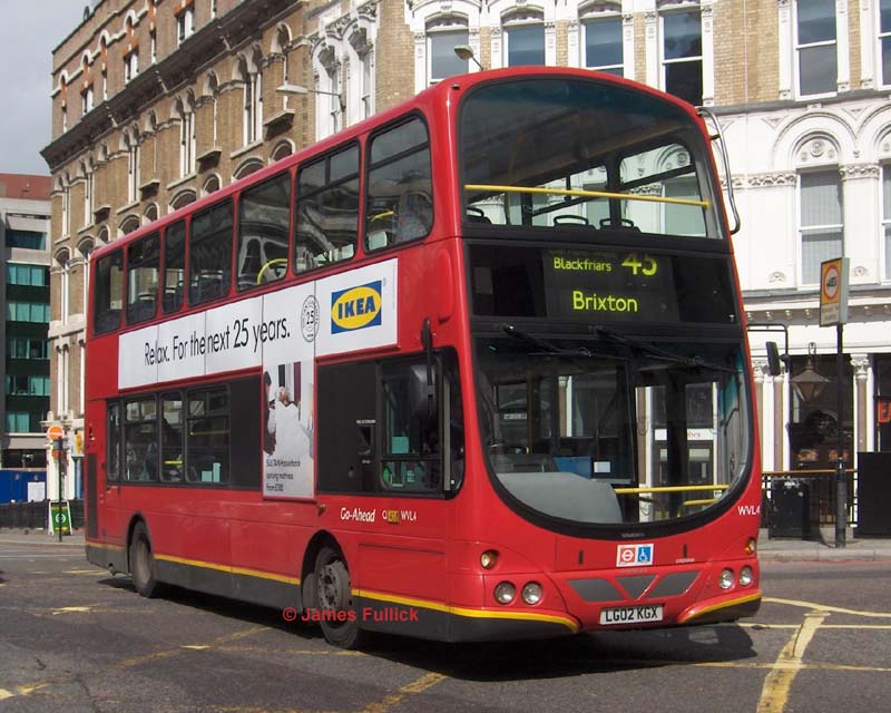 Camberwell garage also now has a substantial quantity of Wright Eclipse Gemini bodied Volvo B7TLs. Most of these were bought new for routes 68, 468 and X68 won on tender from Arriva, but some have also been acquired from other garages. In the latter category is WVL4 (LG02 KGX) on Farringdon Street, near Blackfriars station, on 14 April 2006 on a short working to Brixton, complete with a badly set number blind.