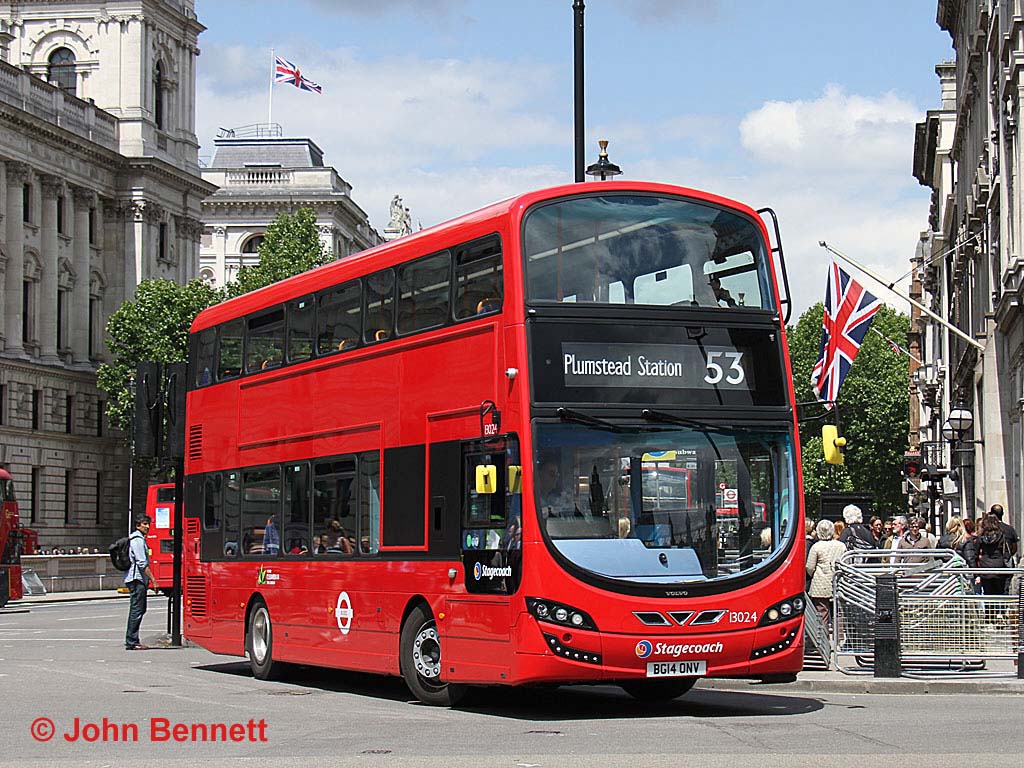 Since 15 February 2003 the weekend the first phase of the central London congestion zone started this trunk route has reached no further into the West End than Whitehall. Nonetheless it continues to operate as a fairly lengthy trunk route across south east London. Like many routes entering central London, the route has recently been re-stocked with hybrid vehicles. Unusually for Stagecoach these are Volvos, and 13024 (BG14 ONV) turns from Whitehall into Parliament Square before heading to Westminster Bridge on Thursday 5 June 2014.