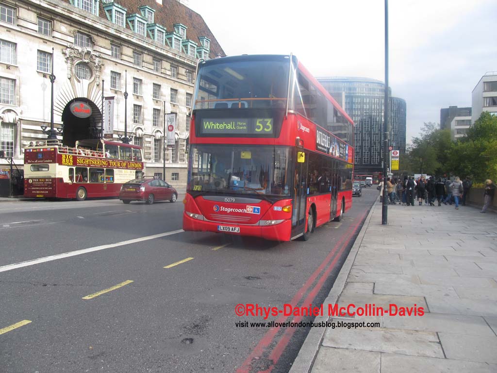 I don't have a photo of a hybrid Enviro400 to hand, but another type that can appear is the Scania OmniCity, which are allocated to the routes home garage, Plumstead, for the 51 and 177. These were obtained at a time when Selkent was not part of the Stagecoach group, but instead owned by Macquarie bank. 15079 (LX09 AFJ) is seen at the same spot as the previous photograph, on 28 October 2011. The nominal destination is Trafalgar Square, but in practice the last stop is quite a way back along Whitehall, hence this more obscure display.