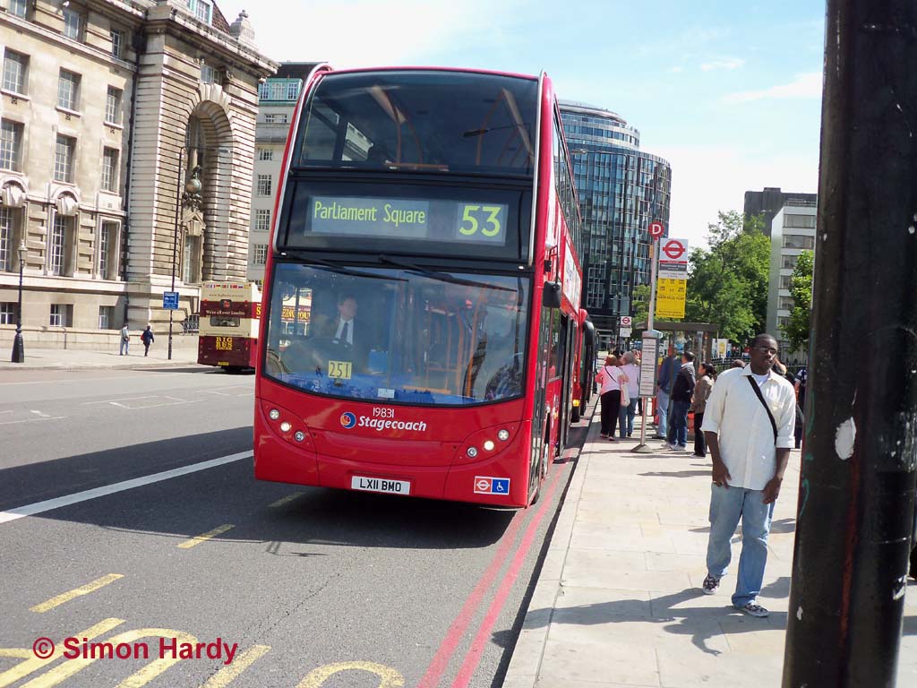 The contract began in 2011 and had already been re-stocked with new conventional diesel Trident/Enviro400s at that time. These are still liable to appear on the route, so I have provided an updated photo of 19831 (LX11 BMO) just about to cross Westminster Bridge from the other side on a short working to Parliament Square on 22 August 2011.