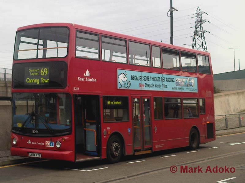 The previous photos on this route were well out of date – the vehicles had left London, low-height double deckers all gone, livery has changed and City Airport is no longer served! The City Airport section was withdrawn when the new DLR branch opened, leaving the local service in the hands of the 474. Long wheelbase Tridents are still the norm though, Leyton until recently having had a monopoly on the type. One of the newer examples is 18254 (LX04 FYY), demonstrating the forward door position favoured by Stagecoach (who owned East London when they were ordered) as it stands at Canning Town bus station waiting time on 5 December 2009.