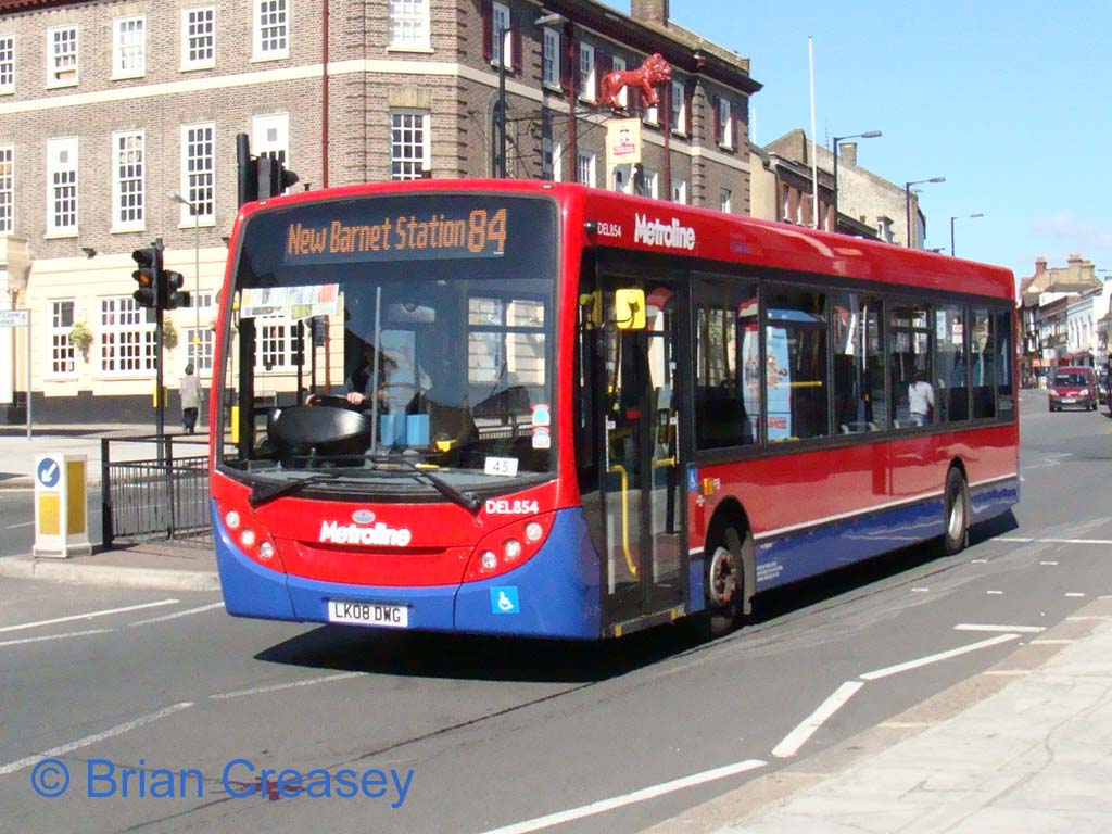 Two photos have been obtained. The first shows DEL849 (LK08 DWA) opposite Potters Bar garage on Saturday 5th July 2008. Second is DEL854 (LK08 DWG) in Barnet on Friday 15th August. Dot matrix displays have often been problematic for photographers, as they often flash meaning they may be "off" when the shutter is opened, but these two are quite clear.