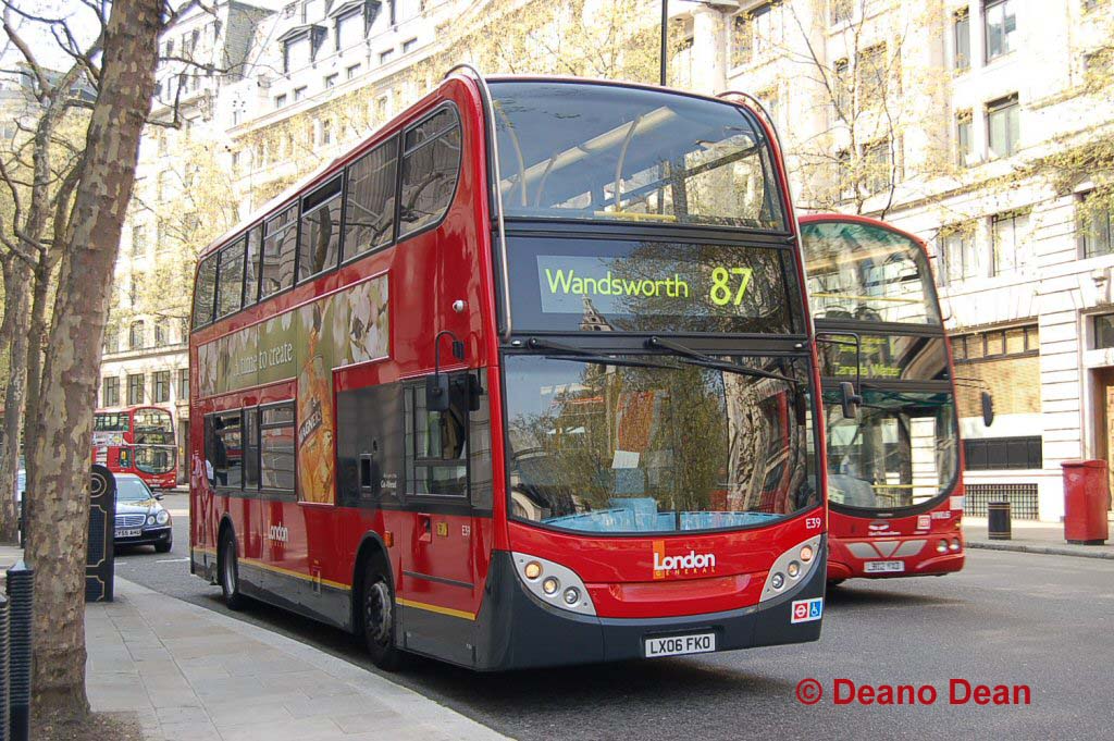 The new contract for the 87 incorporated a modest frequency increase, and the main allocation of existing PVLs was topped with with two new buses, E38 and E39, the last of which is seen at the Aldwych terminus. The E allocation has subsequently expanded, the main allocations being to routes 196 and 24, but it is understood that the destination blinds on the Es have been altered and can no longer display 87, even though the type is are scheduled on the route!