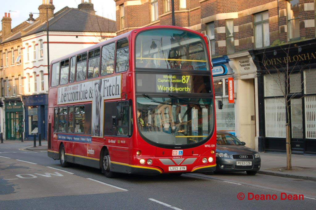 The other major type at Stockwell garage is the WVL class of Wright Eclipse Gemini bodied volvos, and are represented by WVL139 (LX53 AYM). The bus is one of a batch intended for route 11, which most unusually carry route branding – neatly illustrating the perils of this idea! I was not informed of the location so, not being intimately familiar with the buildings and shops along the 87 route, my best guess would have to be the top end of St. John's Hill, between Clapham Junction and Wandsworth. The bus is evidently facing south-west, from the position of the shadows. If anybody recognises the spot, please do get in touch!