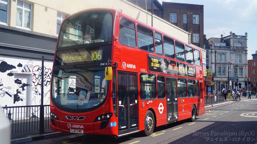 A second view is provided by DW520 (LJ13 CME) laying over at Finsbury Park on 6 May. Finsbury Park has two bus stations, one each side of the railway, which cuts the bus network in two due to a low bridge, and this is the southern one.