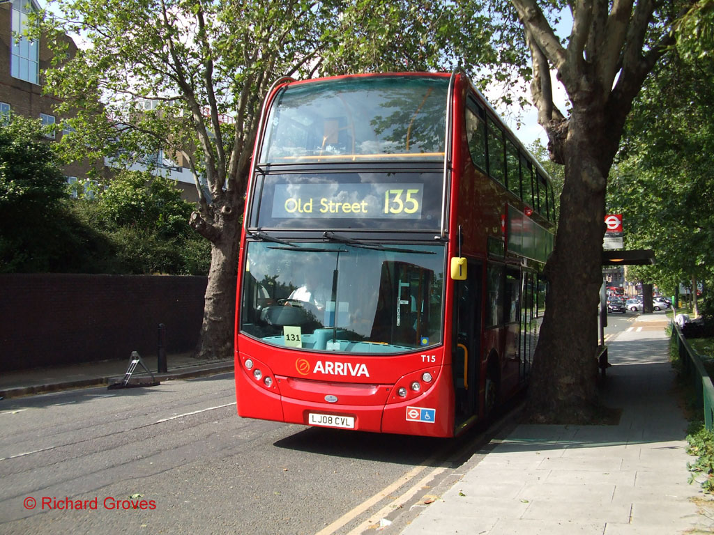 The route was awarded to Arriva, which operates it from the former Grey Green Barking garage – some way off route, although this route does not pass particularly near any other garages. New Enviro400s are used, from a large speculative order placed by Arriva last year. Most unusually they have a form of route branding to help promote the service, although this has been fitted to the standard advert frames and is therefore likely to be temporary. The "U-bend" the route does in the Isle of Dogs rather neatly coincides with the "T" part of the advert frame! The vehicles show the latest form of Arriva London livery, which has lost the "cow horns" stone-coloured feature, and is thus all red apart from a yellow band above the skirt area. The blind displays are plain, but neat and clear.