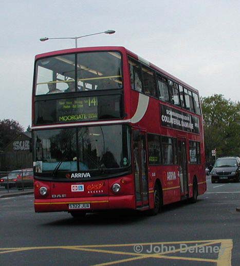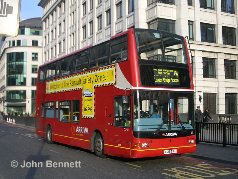 A few older buses are still liable to appear on the 141 from time to time, so a couple of samples have been included for completeness. DLP50 (LJ51 DJU) is a Plaxton President bodied DAF DB250LF and was seen in King William Street about to cross London Bridge at the end of a trip from Palmers Green, again on Tuesday 24 January 2006. The photo dates from a time when Wood Green and Palmers Green had a joint vehicle allocation, with only light maintenance done at the latter garage. They have now been split up with the majority of DLPs, including this one, going to Palmers Green – but a few DLPs remain at Wood Green.