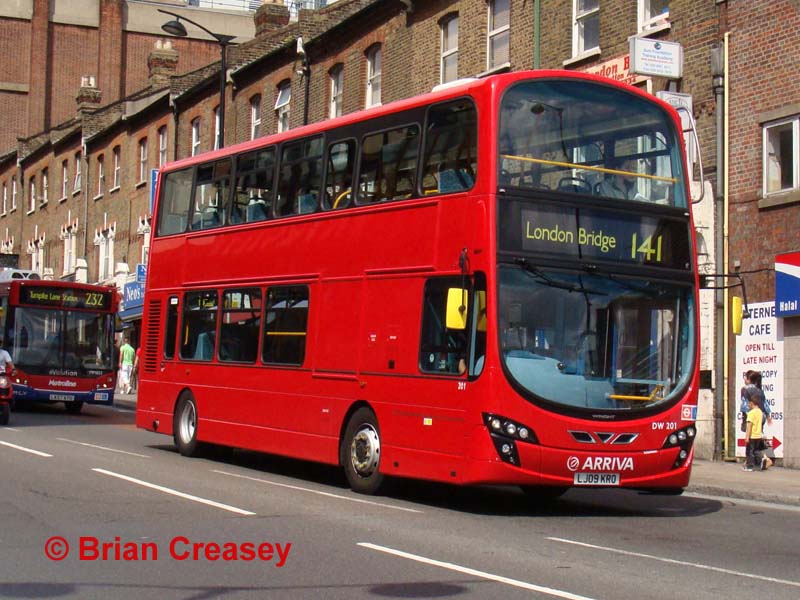 However, a large batch of conventionally engined versions of the same combination is currently in course of delivery for route 38, and are temporarily being used on the 141. DW201 (LJ09 KRO), the first of the batch, is seen on Thursday 13 August 2009 approaching Wood Green Station down Jolly Butcher's Hill. As noted above these are to the new Gemini 2 design, and the re-designed front can be contrasted clearly with the older buses shown above. The class code is shared with Pulsar Gemini bodied DB250LFs, but a clean break has been made in the numbering.