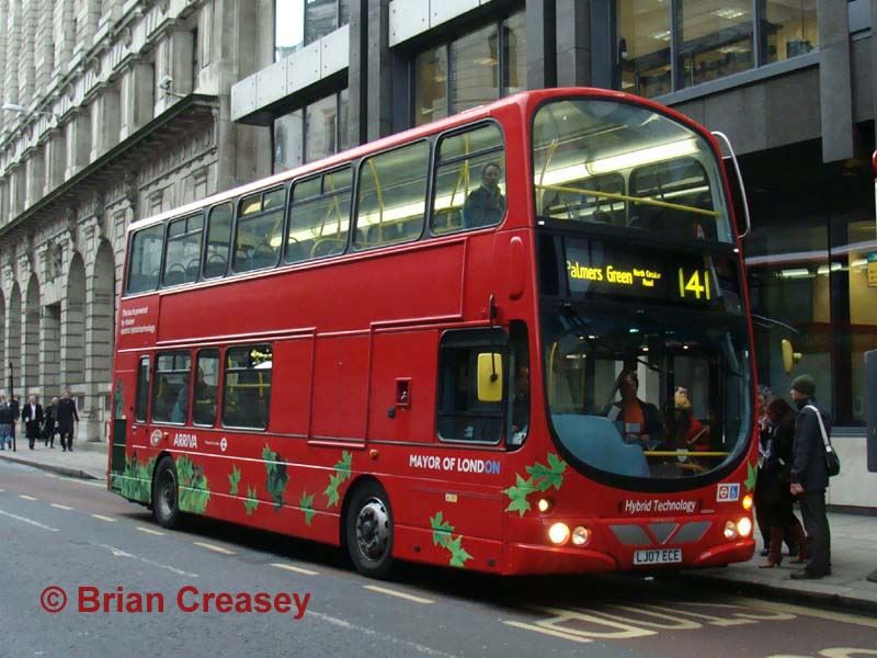 A one-off on the 141, and probably not for much longer, is the prototype hybrid VDL DB250, HEV1 (LJ07 ECE), seen at Bank on Tuesday 13 January 2009 heading northbound. This was the first hybrid double decker and has spent considerable periods off the road under test. The green leaf livery is now becoming familiar as hybrids become more common around London.
