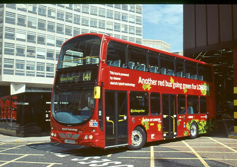 The 141 is becoming something of a hotbed of hybrid activity, with two larger batches of hybrids coming to join HEV1. First into service are the HV class which are based on Volvo B5L chassis. To confuse matters the body design is merely the Wright Gemini, but with Gemini 2 styling at the rear, and is already defunct – see the following picture! HV4 (LJ09 KOU) pulls out of London Bridge bus station on Wednesday 1 July 2009. The office block in the background is about to be demolished to make way for the "shard of glass," destined to be, for a short while at least, the tallest building in London.