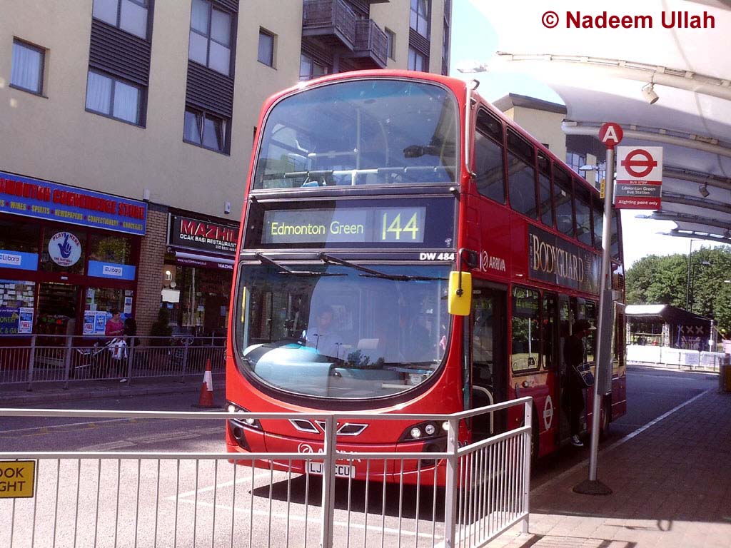 However, during 2013 new hybrid buses were introduced on route 29, and consequently the buses previously on the route were displaced and moved over the the 144 among other new homes. They had only intended to be temporary on the 29 in order to effect an early conversion of the 29 from bendy buses to conform to the Mayor's pledge to withdraw the latter by the end of 2011, the 29 contract having another year to run at the time. The buses are of the DW type which is really the successor to the DLA, but with Wright Gemini bodywork instead of Alexander, and a much updated chassis and engine. DW484 sets down passengers at Edmonton Green bus station on 1 August 2013.