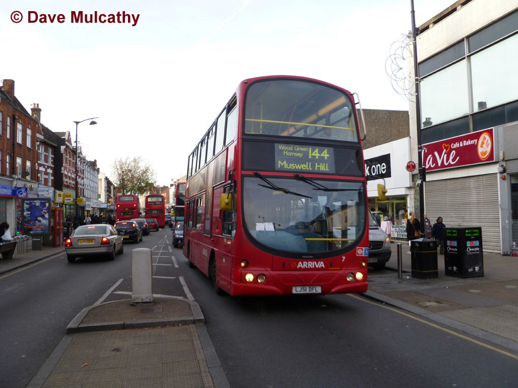 The DLAs and DWs have been the major double deck classes for Arriva London, but another which was amassed intermediately was the VLW class Volvo B7TL, again with Wright bodywork. Arriva actually received the very first buses built to this revolutionary design with a speculative order for 50 of the type (that is to say, not ordered in respect of specific requirements – unusual in London's regimented contractual environment). These buses were allocated to Wood Green and although many have now been displaced, the class is represented on the 144 by VLW7 (LJ51DFL) again in Wood Green High Road on 25 November 2011.