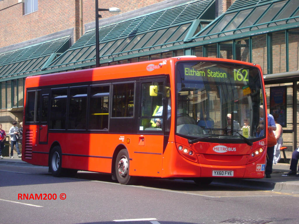 Thus short Enviro200Darts now ply the 162, and two views are provided here. First we have 160 (YX60FVC) in Well Hall Road, Eltham, on the first day of Metrobus operation, 19 March 2011, setting off on the lengthy trip to Beckenham. Secondly we have 162 (YX60 FVE) in a neat fleet number/route number match, in Bromley on 20 April 2011.
