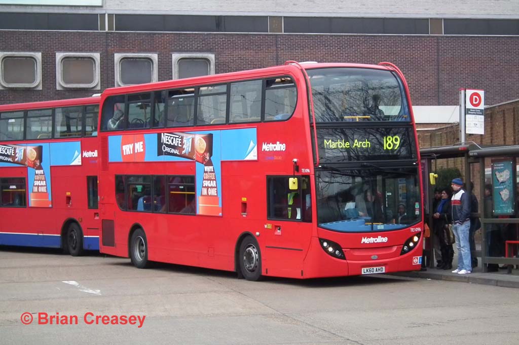 Non-hybrid Enviro400s also appear on the 189, and TE1096 (LK60 AHD) picks up at Brent Cross on 21 February 2011. This is technically a Trident rather than an E40D. At the time the route was diverted to Marble Arach instead of Oxford Circus, owing to Crossrail works at Bond Street station, involving a major diversion