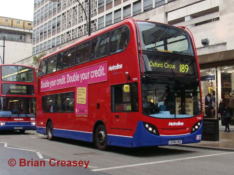I have retained a picture of one of the earlier Trident/Enviro400s, with the older blue skirt livery, TE903 (LX58 CNO) was seen in Oxford Street on 5 November 2008 – demonstrating the over-bussing of routes in this street, as it is practically devoid of passengers! New London mayor Boris Johnson has promised to tackle the "wall of red buses," although whether cuts will be targeted where they can be sustained remains to be seen.
