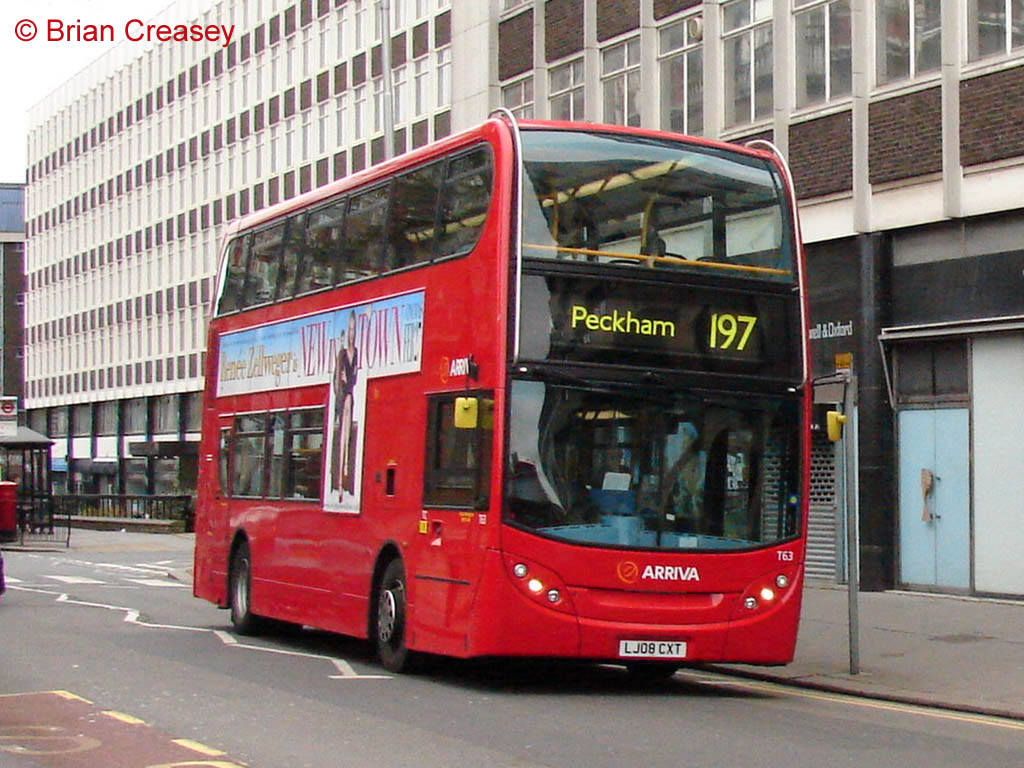 Croydon garage also has a number of T-class Enviro400 bodied Tridents, officially for route 466, and these can often be seen on the 197, especially on Sundays. The class is represented by T63 (LJ08 CXT) passing along Katharine Street in Croydon town centre on Thursday 12 March 2009.