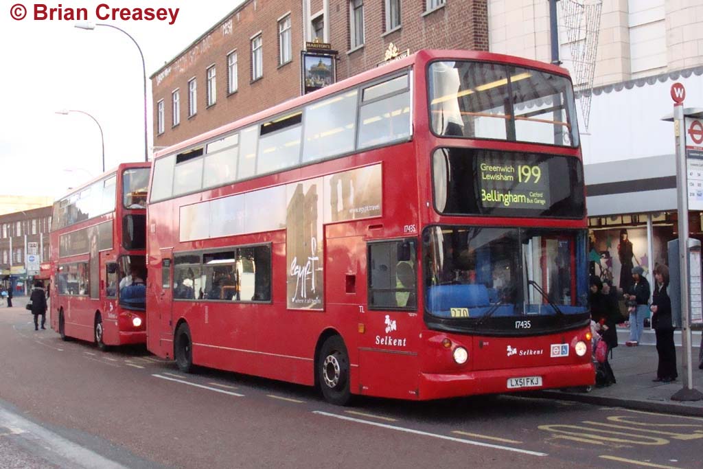 The last two incarnations of the 199 were both Titan worked, first from Bromley garage and now from Catford, but the Titans were replaced by new Dennis Tridents towards the end of 1999, to tie in with the Jubilee Line change. Selkent has passed back to Stagecoach, so I will try to update some of their routes as well before too much corporatism creeps in! Although the 1999 Tridents are still at Catford, later batches of Tridents are more common and little effort is made to separate either the different batches or the different lengths. Having said that, both buses featured here are the long wheelbase version, as should be. The first is an oddity, 17435 (LX51 FKJ), a solitary Selkent vehicle delivered at the end of a large batch for East London. It was photographed on Thursday 5 November 2009 in Lewisham High Street.