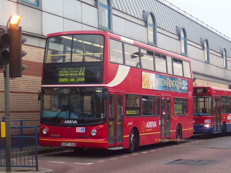 The route is run from Wood Green garage using some of the oldest double deckers in London, DLA class DAF DB250LFs with Alexander ALX400 bodywork. The vehicles on this route are among those to have had rear windows fitted – for some reason the body builder did not provide these originally. DLA37 (S237 JUA) is seen in Edgware Bus Station – obviously, before the current protracted closure for resurfacing work! The precise time was 19:35 on Wednesday 26th May 2004.