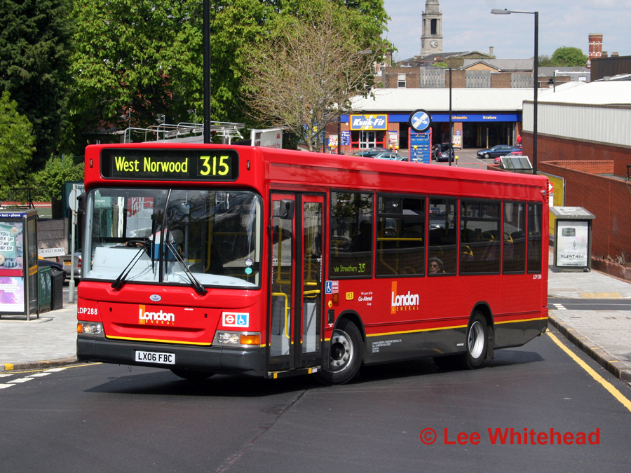 One of London's smaller routes in the 315, running between West Norwood and Balham – which stations on the same railway line, taking 7 minutes by train compared with around 25 minutes on the bus! As the route only runs every 20-30 minutes only 4 buses are needed, which is most unusual for a route this close to central London. It is currently run from London General's Stockwell garage using Mini Pointer Darts, and LDP288 (LX06 FBC) approaches the terminus at Norwood bus garage in May 2006.