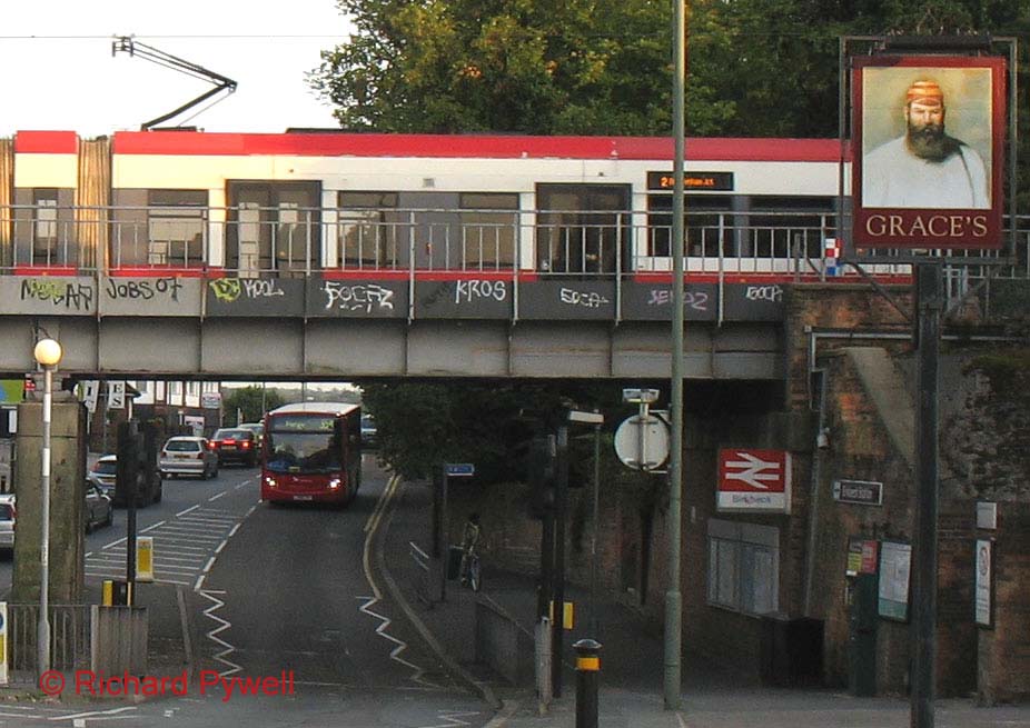 An unidentified member of the batch approaches Birkbeck station on Monday 15 September, while a tram passes over the bridge. The pub on the right is named after the famous cricketer W.G. Grace, who is buried in the adjacent cemetery. At the same location, but facing the other way on the other side of the bridge, and giving a better view of the vehicle itself, is 36016 (LX58 CBF) on the same date.