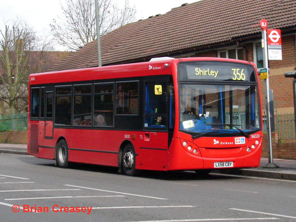 Seen in Elmers End Road opposite Beckenham Crematorium on Wednesday 4 March 2009 is 36020 (LX58 CBY), another of the 356's own batch. The location is just along the road from Birkbeck station, where connections with Tramlink are available, reminding us of the history of the route's creation. The modern houses in the background were built on the site of the aforementioned Elmers End bus garage, which closed in 1986.