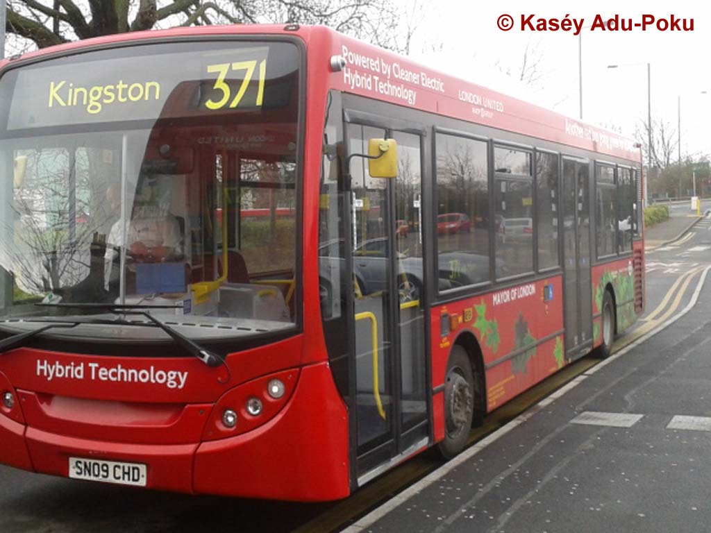 Early hybrids carried this green leaf livery and prominent branding. As hybrids became more common this was dropped in favour of discreet branding on standard red. The HDEs, in line with other single deck hybrids, have a huge pod on the roof to accommodate the battery pack. This actually makes them too high to run on some routes! The 371 passes over Richmond Hill, which was initially thought to be a good test bed for hybrid buses, and also resulted in a brief trial of some prototype battery-power Scania vehicles a few years ago.