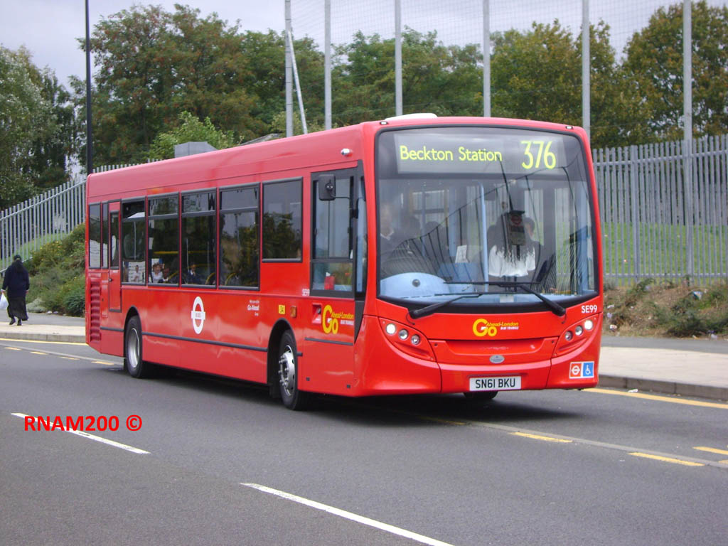 Anyhow the new buses are 10.8m Enviro200Darts, amogst the first Go-Ahead London buses to succomb to overall red, the company having held out with its grey skirt and other relief until the very last hurrah. Go-Ahead London seem not minded to distinguish lengths, and so the class is still SE, and SE99 (SN61 BKU) passes the grounds of Newham Hospital on 20 September 2011, the first week of Go-Ahead operation. The loss of this route and the 276 by Stagecoach London, and some other routes earlier in the year, has precipitated the closure of Upton Park garage, once the largest garage in London, though latterly holding a more modest allocation of just over 100 vehicles. The destination of Beckton Station reflects the move of the bus station at East Beckton round the corner, where it is now roughly opposite the DLR station rather than off Tollgate Road.