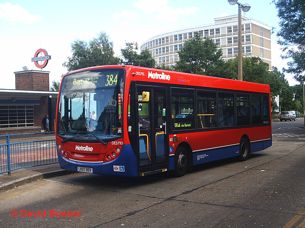 The route has recently gained new buses, and two views are provided here of the standard type: DES799 (LK07 BEU) passes through one of the back streets of Barnet on 15 August 2008, while DES793 (LK07 BDV) was caught at the Cockfosters terminus on 5 July 2008. The Piccadilly Line terminus, designed by Charles Holden and opened on 31st July 1933 - so a few weeks short of its 75th birthday when the photo was taken - can be seen in the background. Both photos show the incorrect "P" garage code applied to the buses – there must have been a shortage of "B" transfers!