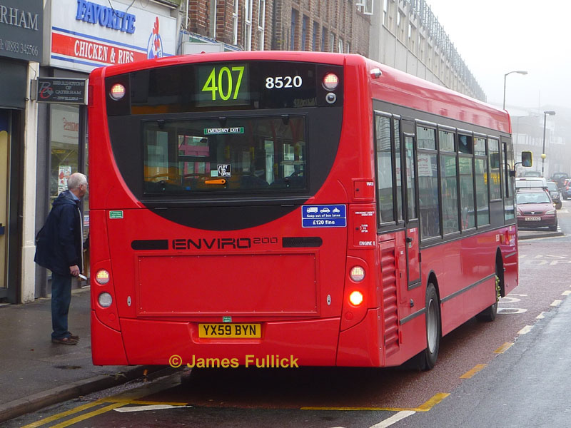 Regettably these vehicles represent a reduction in capacity, as they are the shorted 10.2m length. TfL's specifications for single deck routes normally simply say that buses should have a capacity of at least 55, and the short version meets this requirement so there is no incentive for operators to provide longer buses. A rear view has also been provided, with 8520 (YX59 BYN) at the terminus in a foggy Caterham on the same day. The big "smile" on the rear is a distinctive feature of the Enviro family.