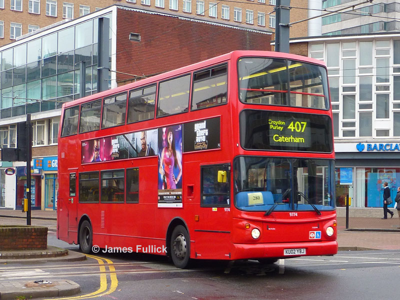 The 407 has scheduled double deck workings on Mondays to Fridays to deal with schools loadings, and surprisingly the vehicle for this was not specified as new. Instead, a Dennis Trident from the existing Travel London fleet is used. Although not on the scheduled working, this operation is illustrated by 9774 (KU02 YBJ) crossing the tram lines in Wellesley Road, central Croydon, the same day. The lack of fleetnames is no doubt in preparation for the addition of Abellio ones when time allows!