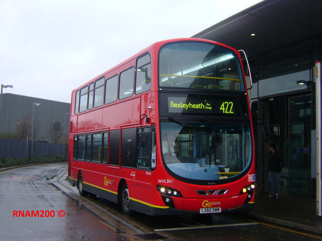 The final photograph on this page is taken at that new destination of North Greenwich bus station, and shows WVL361 (LX60 DWM) on 10 February 2011. The 422 was the first route to serve Bexleyheath from this point, but was joined by the 486 in 2001 and then the 132 in 2009, each taking quite different routes, the 422 being the most northerly of the three.