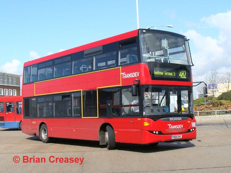 The opening of Terminal 5 in March 2008 led to a review of services. The contract for the 435 was terminated early (along with that for route H50), and the 435 was replaced by route 482. Like the 435, the 482 starts in Southall, but then follows route H32 to Hounslow West and route 203 to Hatton Cross, then picking up the 435 routeing to Terminal 4 and the Cargo area, and continuing to Terminal 5 as the 805 had briefly done. A further frequency increase from 2 to 3 buses per hour was introduced, albeit during Monday to Saturday daytimes only. The new contract was awarded to Transdev (London United) who run it from Hounslow Heath garage, conveniently near Hatton Cross, using Scania OmniCity double deckers built in Poland, now the standard double deck type for the company.