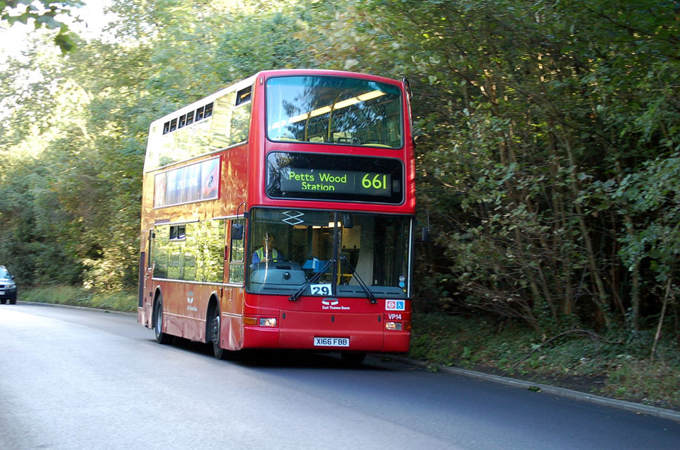 Initially, the DAF DB250s used by Harris Bus were retained, but a relatively heavy programme of fleet replacement was set in motion, eventually converting the whole fleet to low floor. In practice, the 661 normally uses the only remaining acquired buses, which are some Plaxton President bodied Volvo B7TLs dating from 2001, which came to ETB with route 185 following the collapse of DTS and are now the oldest buses in the fleet. VP14 (X166 FBB) is seen passing along Centre Common Road, Chislehurst, on the afternoon working on 26 September 2006. Having said that there was a need to retain the cross-Chislehurst link, there do not appear to be many passengers on this bus!