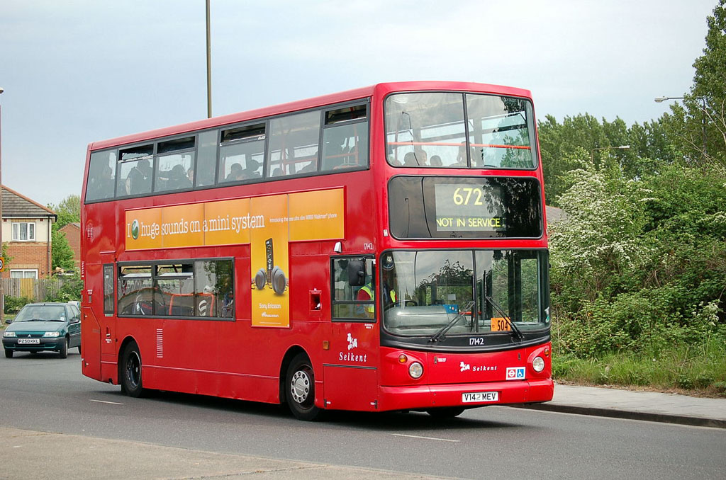 Only two buses are used on the 472, departing simultaneously at 1505 then returning to the school for a second pair of journeys at 1530. The route is operated by Selkent from Plumstead garage using standard long wheelbase Tridents, and 17142 (V142 MEV), one of the oldest buses in the Selkent fleet but looking very smart following a repaint, is seen in Central Way soon after leaving the school on 25 April 2007 with a good load. The blind display of "not in service" is obviously not correct, and shows the sloppy standards that often prevail on school routes – perhaps drivers wish to prevent anybody else trying to board, even though these services are available to everyone.