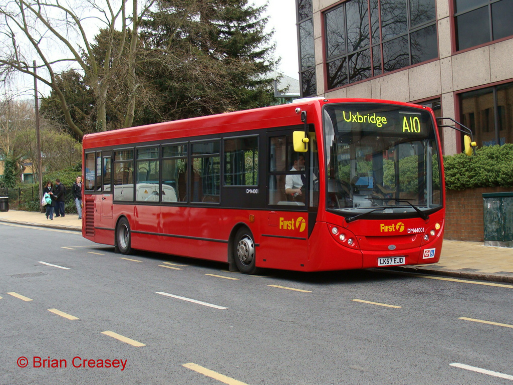 Like the buses on order for the A10, these are standard length Enviro200Dart integral buses, a type now becoming increasingly familiar around London. They seem to be suffering an identity crisis, as though they should be code DML (itself a code also used for Marshall bodied Darts), some have come with DM codes! DML44001 (LX57 EJD), setting down passengers in Uxbridge on 26 March 2008, falls into this category. Centrewest is now part of FirstGroup which recently introduced a national fleet numbering system of up to five digits, which when combined with London style class codes gives Centrewest the longest fleet numbers anywhere in London or, I suspect, the UK. With 8 characters this is in marked contrast to the two character codes of the previous vehicles!