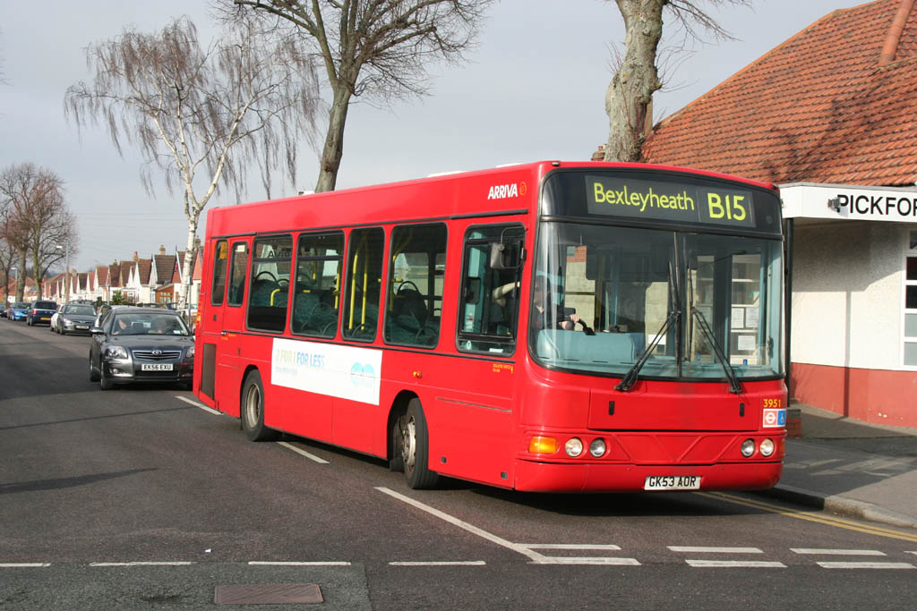 Arriva retained the B15, but the short single door Wright Cadets were transferred to the B12, and the B15 gained larger vehicles in the shape of dual door 10.2m Enviro200Darts. However, crowding problems at the Joydens Wood end of the B12 saw the buses swapped back again after a couple of years, so I have added this photograph of 3951 (GK53 AOR), 9.4m long DAF SB120/Wrightbus Cadet dating from 2004. It was photographed on 9 February 2011 in Dorcis Avenue, on the (then) "new" section of the original route between Bexleyheath and Welling. When new, these vehicles featured the Arriva "stone" coloured "cow horns," but are now all-red to comply with the latest TfL regulations.