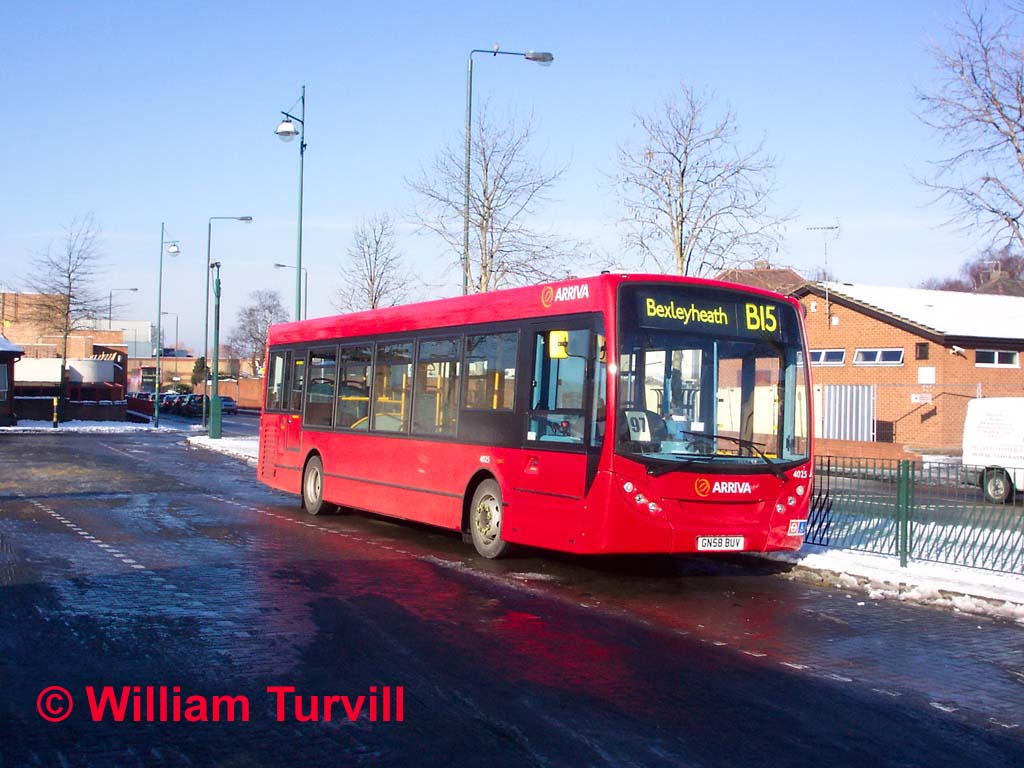 The newer Darts are now normally on the B12, but can still put in appearances on the B15. They are represented by 4025 (GN58 BUV) at Bexleyheath on Wednesday 4 February 2009 when nearly new, with plenty of evidence remaining of the snow that caused the bus network to shut down completely the previous Monday.