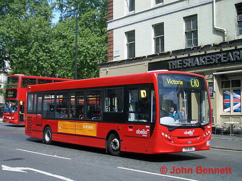 Two views are provided: firstly we have 8561 (YX11 AEL) in Terminus Place outside Victoria Station on Tuesday 3 May 2011. The route is actually on a long term diversion at present and not serving this point – this is due to expansion work at Victoria Underground station. Secondly, we see 8562 (YX11 AEM) at Elephant & Castle on 15 August 2011 – the stop is "London College of Communication" in St. George's Road.