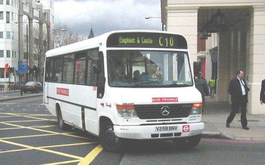 Blue Triangle had made quite a name for itself by stepping in at short notice to run routes where the present operator had got into difficulties in one way or another. It had a large fleet of Metrobuses (double deck) and a smaller fleet of Leyland Lynx (single deck), the only regular scheduled work for any of which being the one-bus 565. But for the C10 neither of these was considered suitable, primarily due to length considerations, so a batch of Mercedes Varios was instead obtained on loan. This included one that had recently been on long-term loan to Stagecoach Selkent at Plumstead, and the buses were painted into a mixture of blue and white liveries. And that was how white V258 BNV came to be turning into John Islip Street, near the Tate Gallery, on 25 April 2001 on its way to Elephant & Castle: