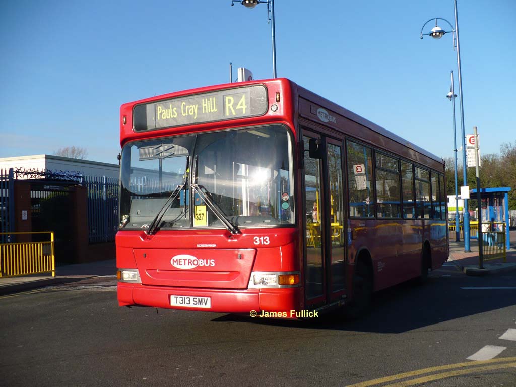 Metrobus often substitutes its own Plaxton Pointer bodied mini Darts, and here 313 (T313 SMV) sets off from Orpington Bus Station, where buses now call in on their way through in another minor deviation, on 11 December 2007, just 3 days after the takeover from First. This particular bus has left the fleet, but there are still plenty of these MPDs around!