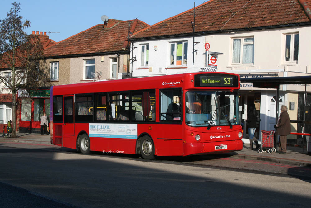 Subsequent developments mean the route now has quite an eclectic allocation. A frequency increase in July 2006 led to some of the 2000 ALX200 Darts, long since repainted from cream and brown to red of course, being repatriated from local routes in Epsom to supplement the Myllenniums. SD28 (W876 VGT) is now one of the oldest buses in the Quality Line fleet and represents the last vestiges of a once quite substantial fleet of Dart SLFs, mostly now withdrawn in favour of Optare Solos. It was located at North Cheam Queen Victoria during a long term diversion on 18 January 2011, which has since been repeated. Surprisingly these buses seem to have survived contract renewal in 2010 and could reach 17 years old in London service!