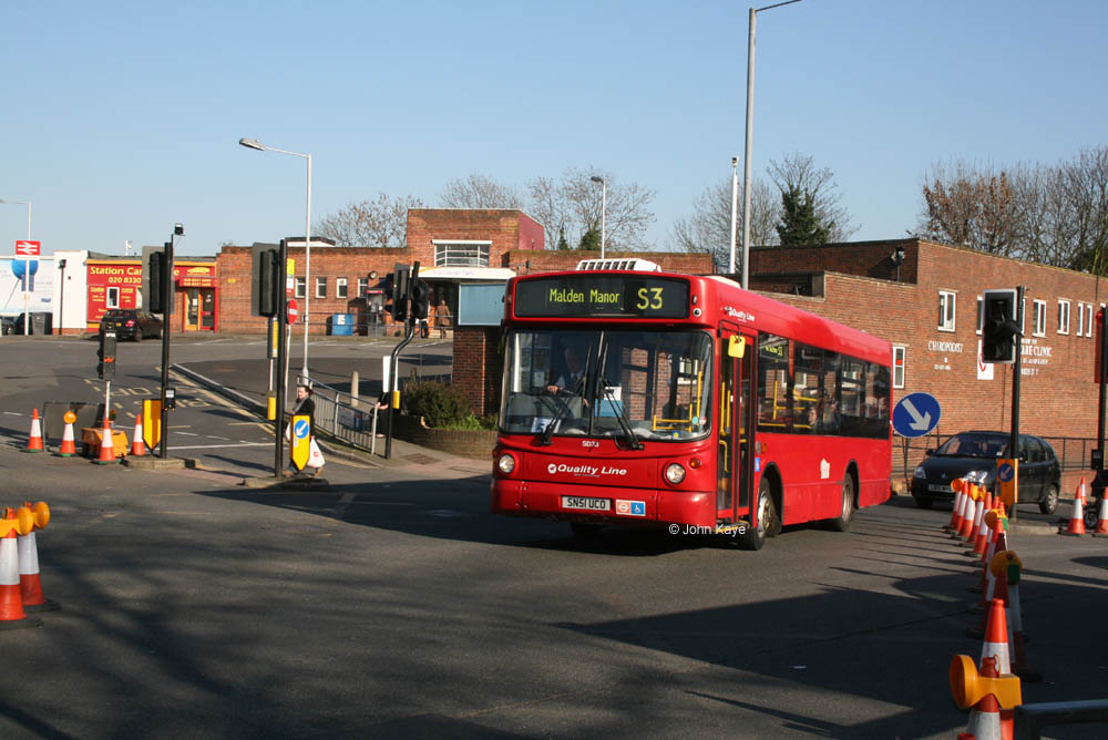 A lone straggler is SD33 (SN51 UCO) of the same type, a leftover from a batch for route S1, and photographed at Worcester Park station on the same day. This seems to have been kept back as a spare for use as required. Note the driver air conditioning unit on the roof – Quality Line were well ahead of the game in specifying these long before TfL made it a contractual requirement. Note also the new style Quality Line logos. The cones were part of major gas works taking place in Worcester Park and which caused the closure of Green Lane, hence the lengthy diversion mentioned in the previous paragraph.
